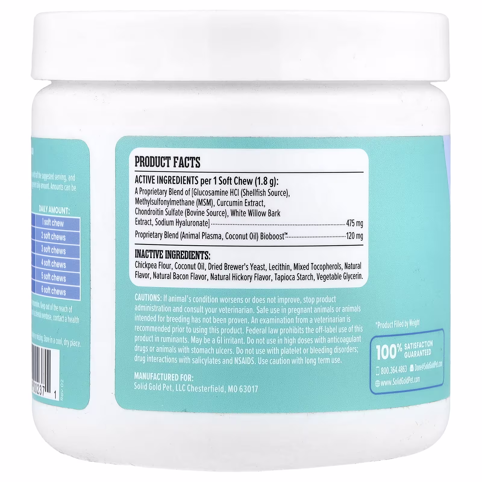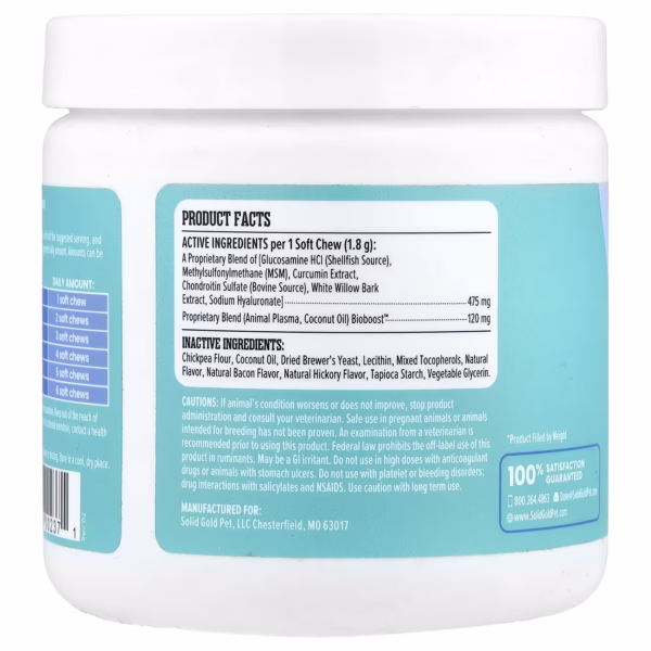 - محصول معرفی شده شامل گلوکوزامین، کندراتین و MSM برای سلامت ران و مفاصل، پشتیبانی غضروف و بهبود عضله است و با BioBoost™ تقویت میشود. مناسب برای سگهای دوست داشتنی شما و در مورد نحوه مصرف آن پیشنهاد می شود که : دو بار در روز به سگ تان بدهید تا میل نماید